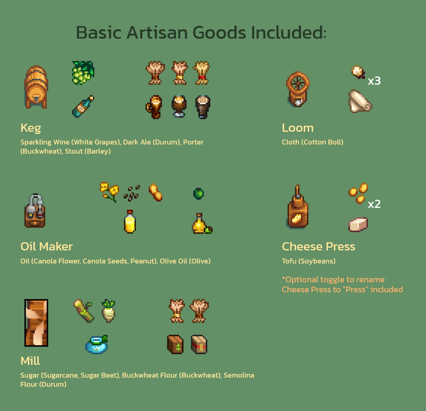 主观体验: 制作链条更加完整了,我现在可以自给自足生产面粉和糖,减少了对皮埃尔商店的依赖。高度可配置:可以通过Generic Mod Config Menu启用或禁用特定的作物包和树包。