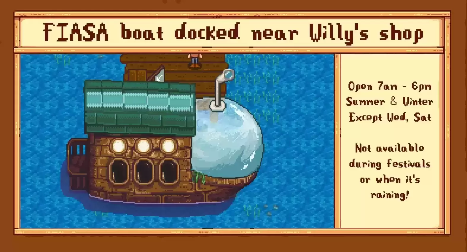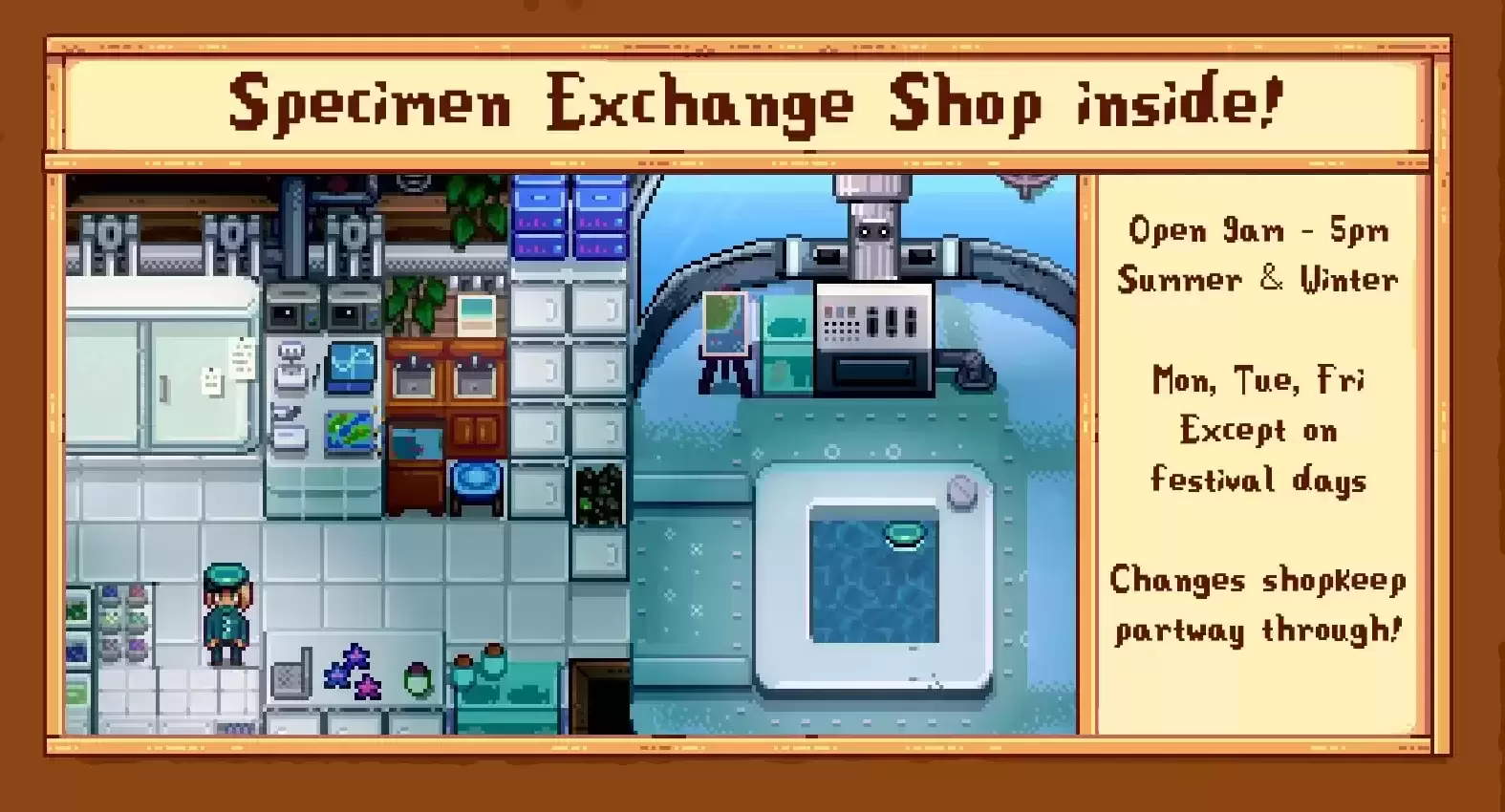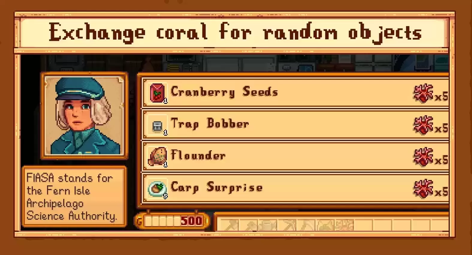 里面有一家商店,里面有随机选择的物品,就像森林里的旅行商人一样。这些物品每天在商店开门时都会刷新,而且价格都完全相同 - 珊瑚 x5。 这个想法是玩家正在帮助他们进行研究。从游戏性的角度来看,这是收集社区中心所需随机物品的另一种方式,如果幸运的话,这是一种以便宜的价格获得昂贵物品的方法!