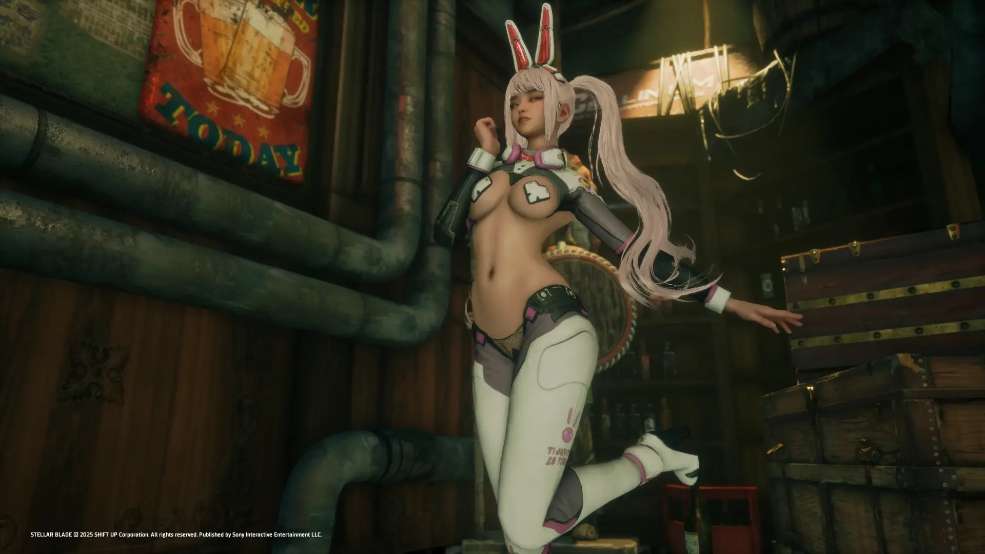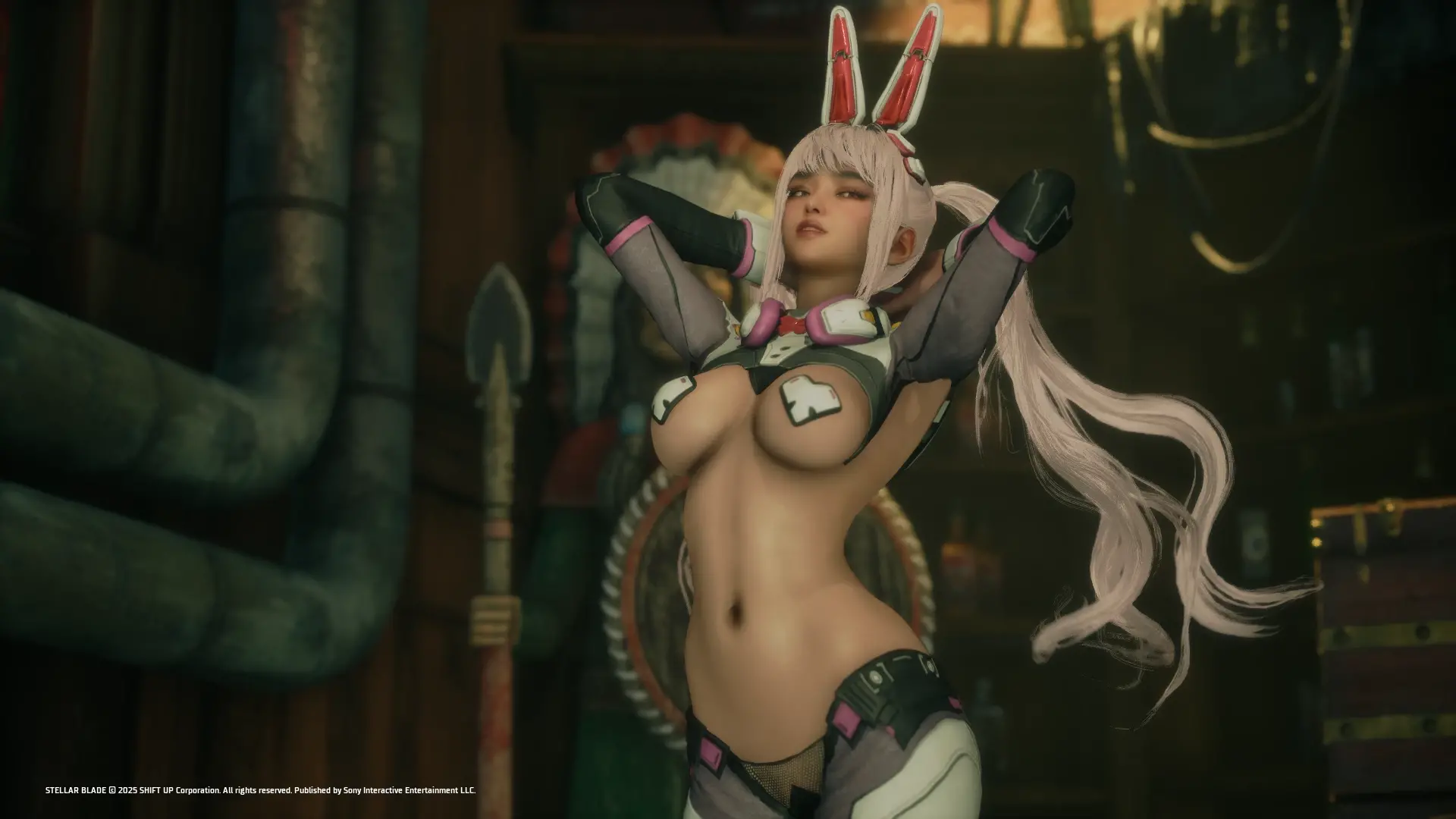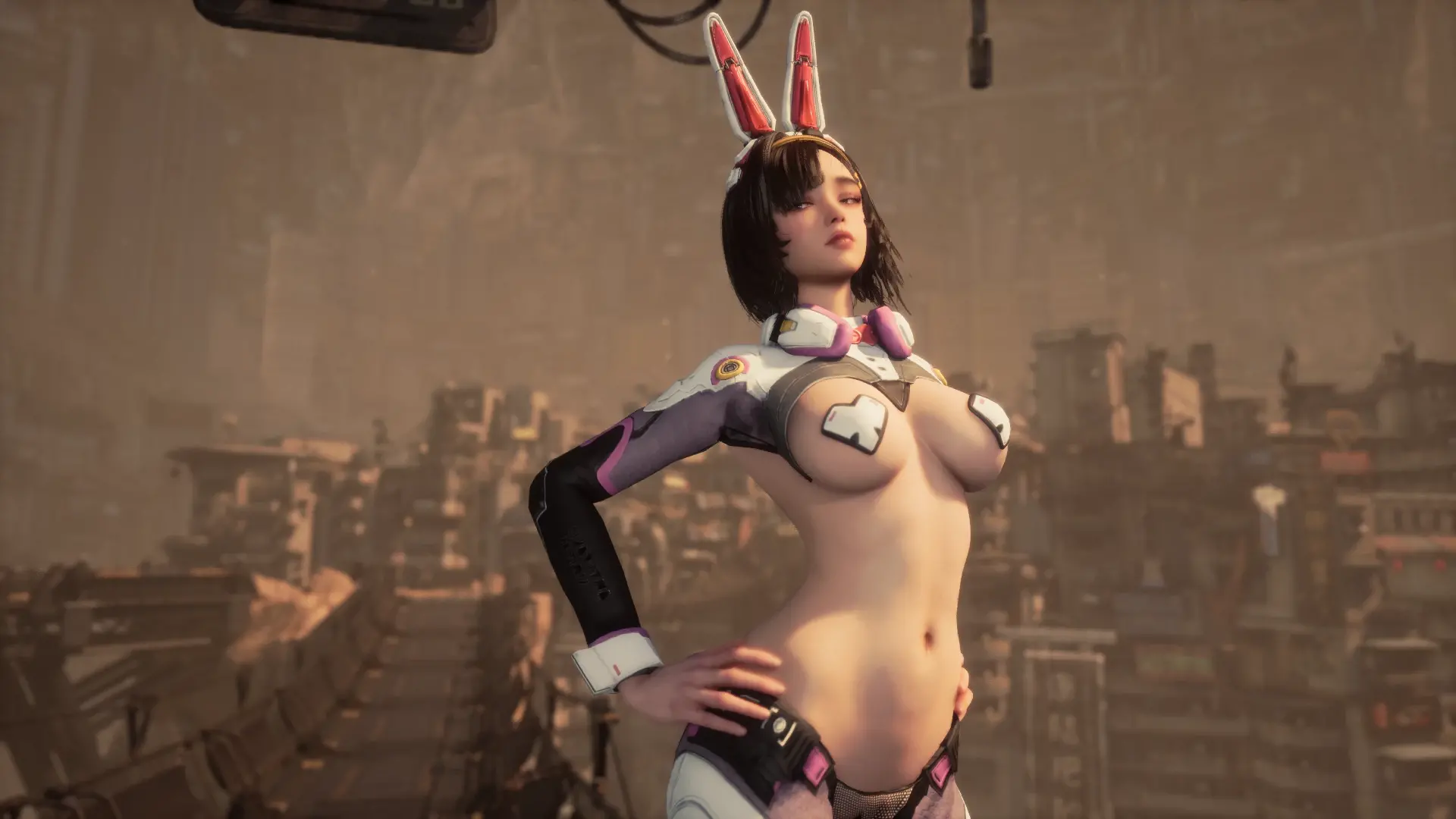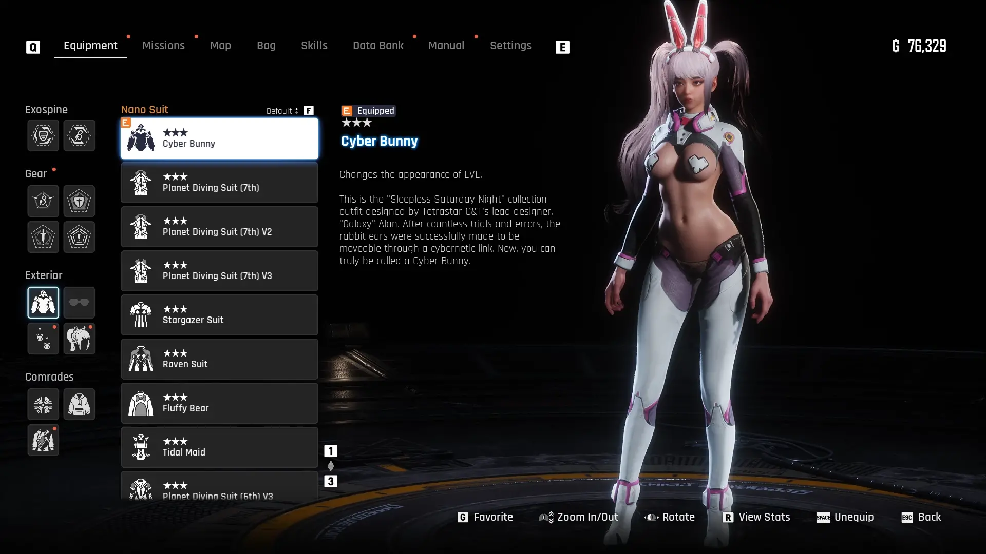 《剑星》跨游戏联动内容:将赛博兔女郎套装及耳饰替换为《Eros崛起》中Alana的钢铁兔战衣及兔耳配饰。