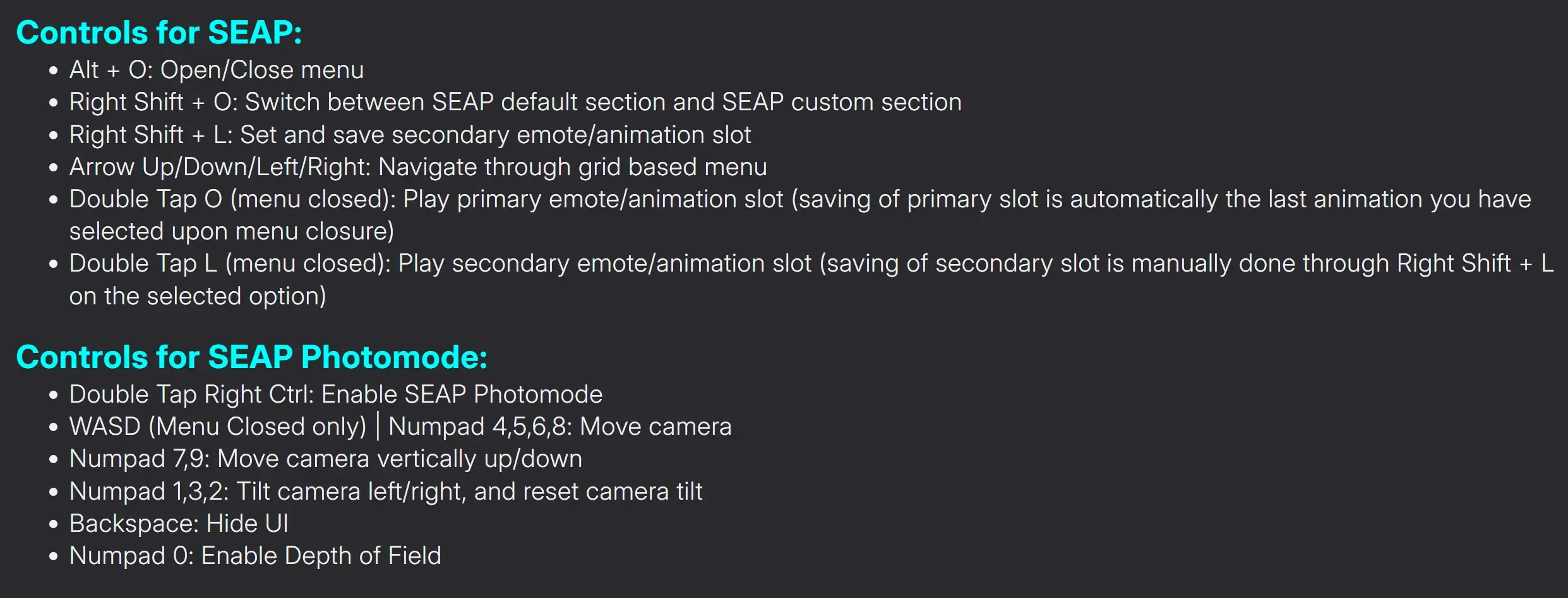 Simple Emote-Animation Player (简称SEAP) 是一个简易动画播放系统,可以在玩家角色上播放自定义动画。它既是一个面向最终用户的MOD,也是一个面向MOD开发者的框架。