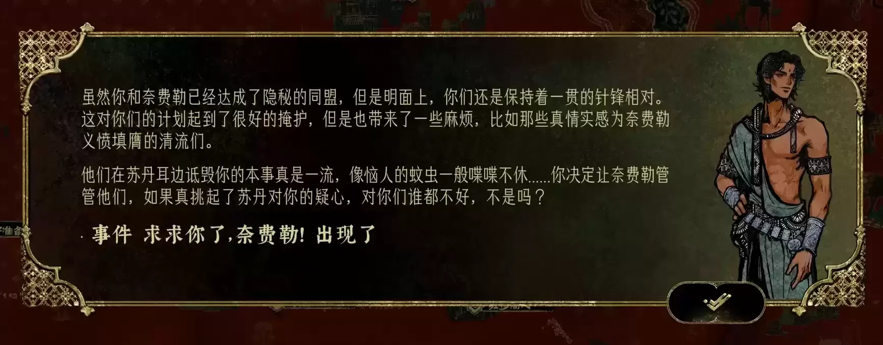 10.奈费勒帮你消除一次谗言后开启地点【书斋】,谗言数量>=2时可以继续消谗言,还可以无限制消除苏丹的猜忌(但是会涨谗言)。什么都不做可触发奈费勒送书