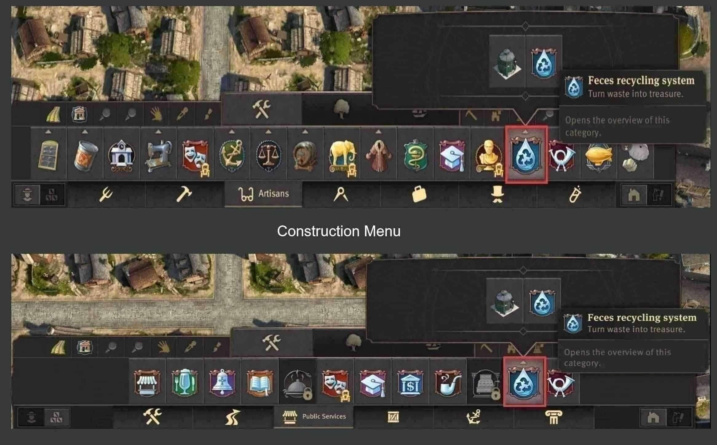当你拥有【1500 名工匠】和【300 名 Obreros】解锁一个名为【粪便回收系统】的建筑目录时,在【工匠】建造菜单和【公共服务】建造菜单中找到它