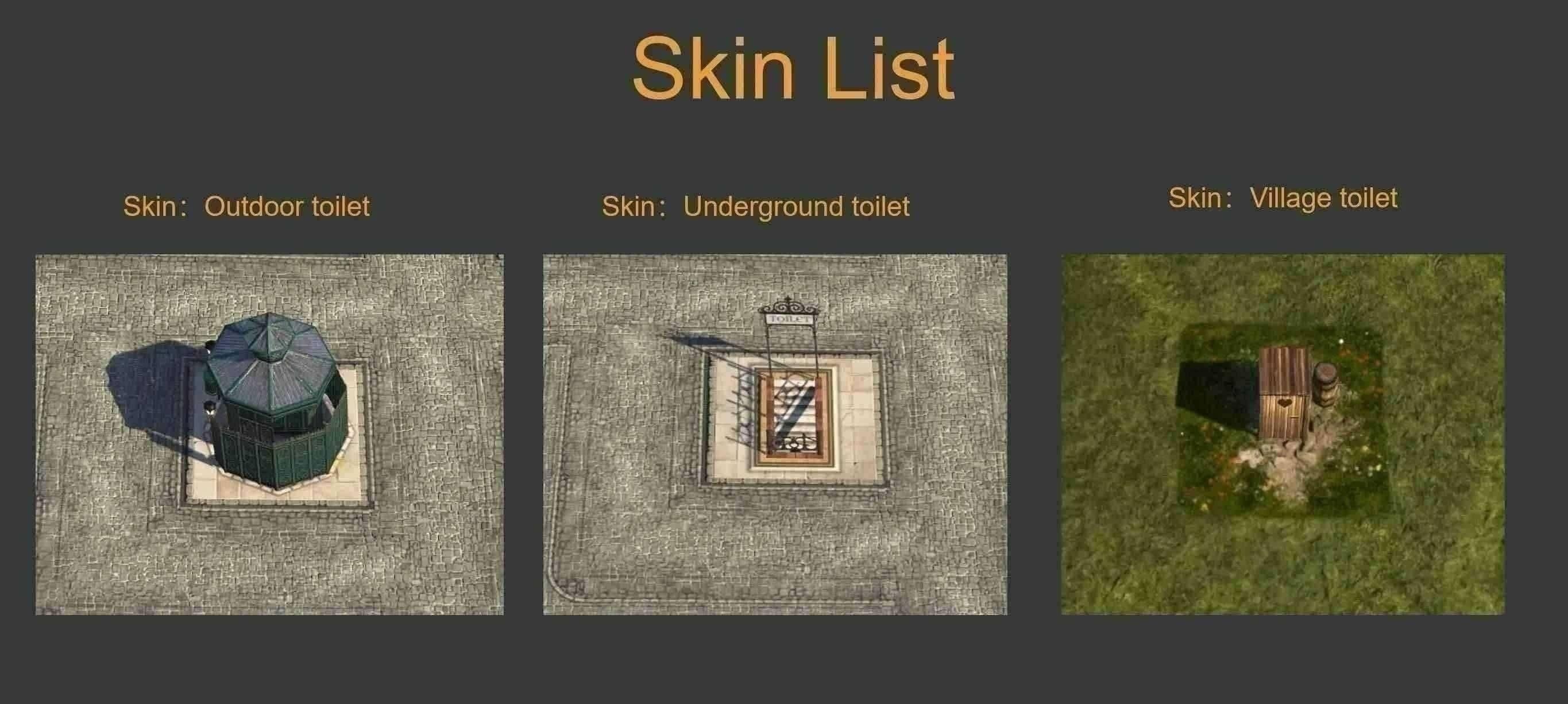 (3) 为厕所添加 3 种不同的皮肤以适应不同的城市风格,从建筑皮肤列表中选择它们