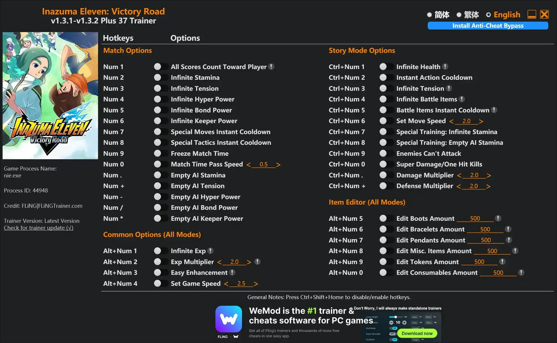 这是由FLiNG制作的《闪电十一人:英雄们的胜利之路》专用多功能修改器,提供多达37项强大功能。它全面覆盖了比赛、养成和故事模式,让你可以轻松掌控赛场——从无限体力、瞬间冷却必杀技,到一键清空对手能量,乃至修改各类道具数量,让你打造无敌的足球队伍,体验成为传奇的爽快感。