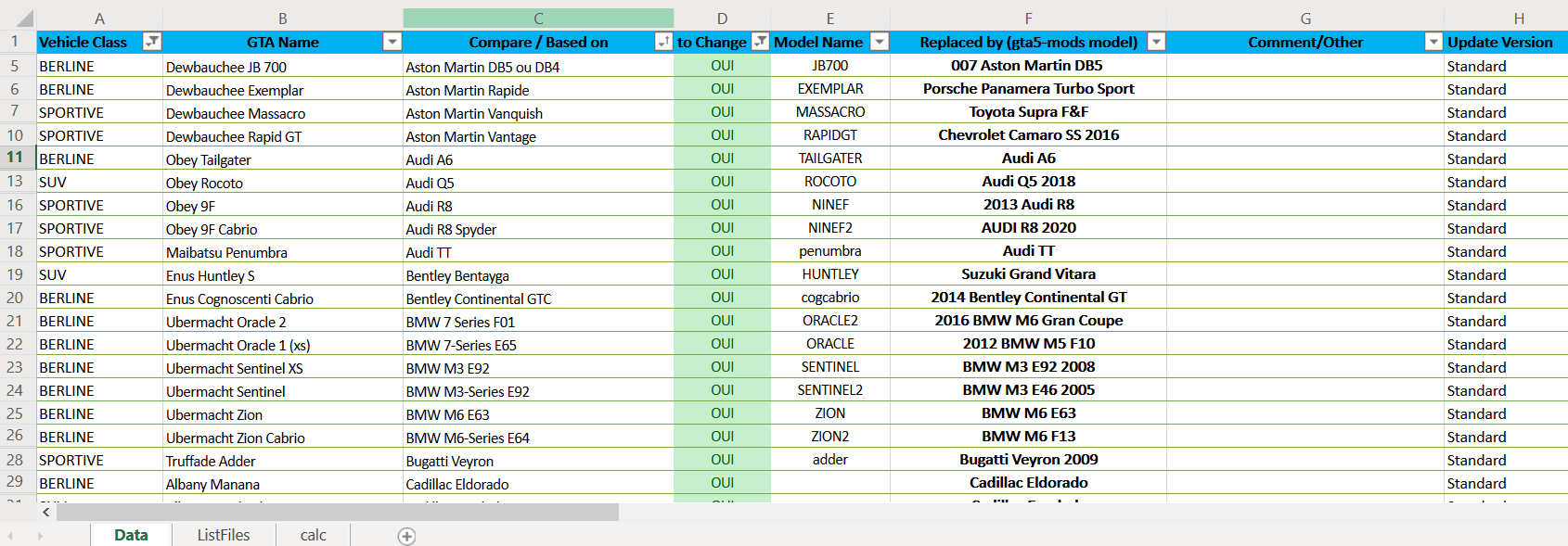 它提供了一个详细的 Excel 数据库,里面包含了所有游戏内车辆的详细信息和参考编号。这不仅方便了玩家进行替换工作,还提供了与真实世界车辆的数据对比,帮助你更好地理解每辆车在游戏中的表现特点。