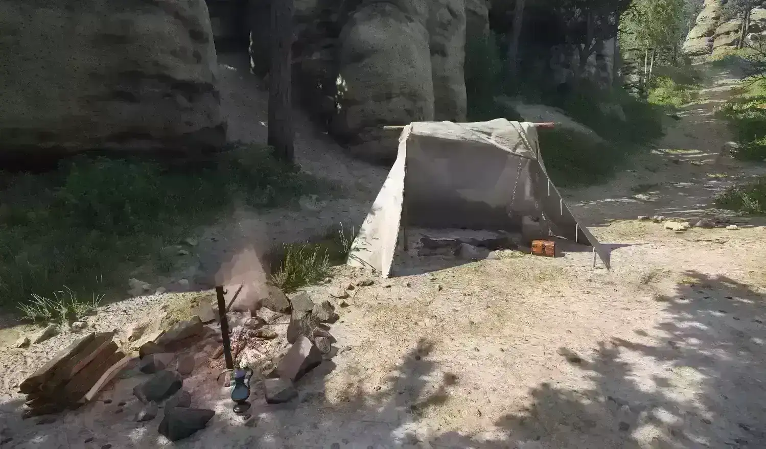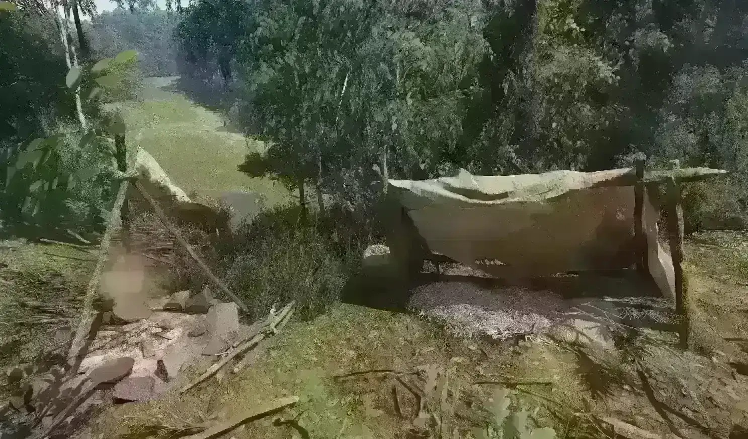 如果你放置了野营床,并且它被任何模型(不可见或其他)挡住,比如树枝、树枝等,它可能会,而且大多数情况下会使动画失败并拒绝让你使用它。所以,如果你把床放下,它不让你睡在里面,就把它捡起来放在别的地方。
