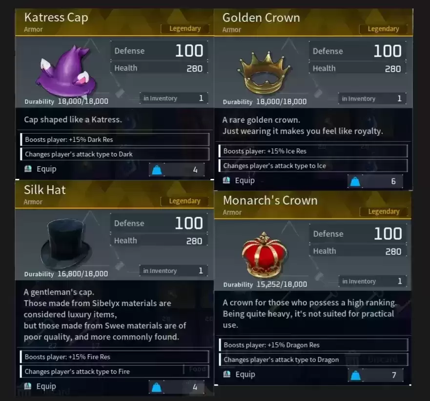 Elem Hat 蓝图 :Jormuntide Boss、朱雀 Boss、Petallia Boss、Gumoss Boss、Mossanda Lux Boss、Kingpaca Cryst Boss、Penking Boss、Anubis Boss、Lyleen Noct Boss、Katress Boss、Astegon Boss