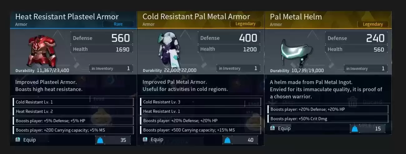 传奇: 提升玩家: +3 主要天气抗性(如果有);+20% 防御;+20% 生命值;+500 承载能力 +1200 用于轻型塑钢装甲);+15% 毫秒