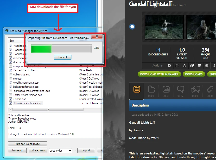 点击导入按钮,选择从火龙MOD网下载的文件,TesModManager会自动尝试从MOD站加载并下载相关信息,大多数文件第一次就能成功导入。