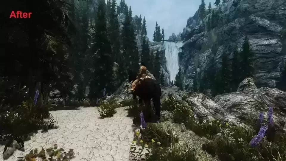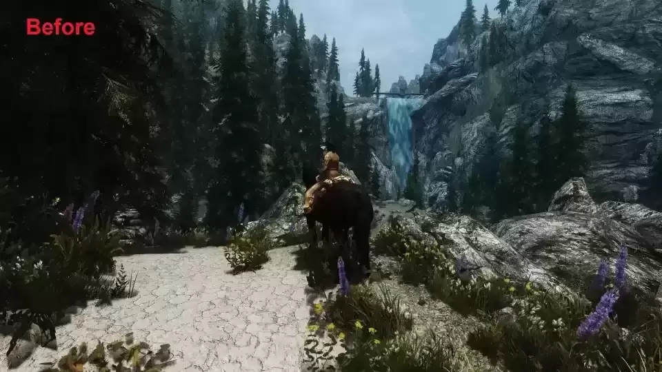 注意:有些人提到了 Grieshe 的 The Skyrim Distance Overhaul LOD Improvement (SDO)。我在我所有的图像和视频中都使用这个模组。这是一个很棒的 Mod,但它不会让远处的瀑布动画化,因为简单地在旧的静态瀑布上勾选“is full LOD”框是行不通的!