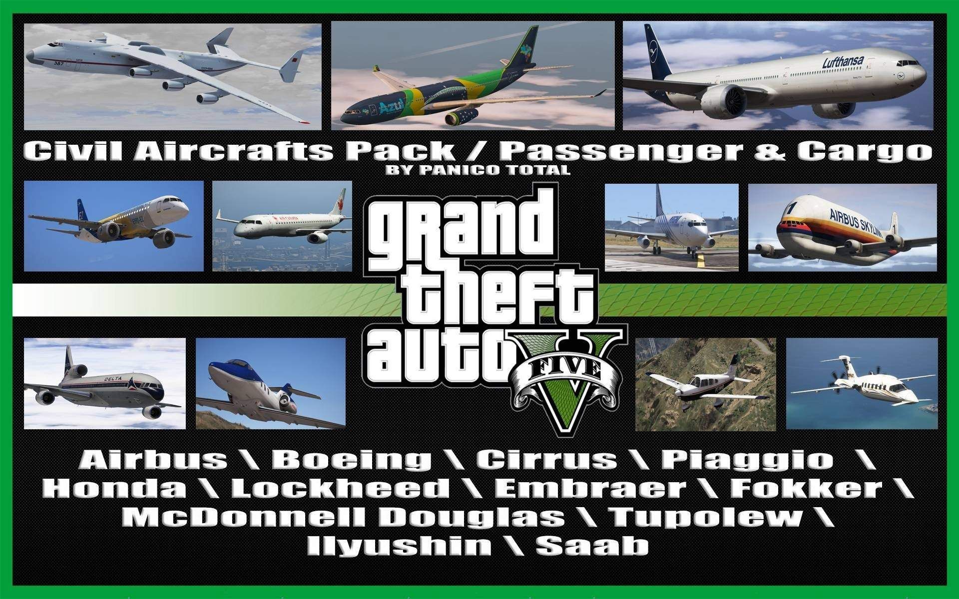 Civil Aircrafts Pack 8.0 是 GTA5 中最全面的航空载具包之一。它不仅包含了大量的经典客机和货机,还新增了包括 AN-225 Mriya、波音737系列等多款飞机,每架飞机都经过精细建模与纹理优化,细节丰富且易于使用。