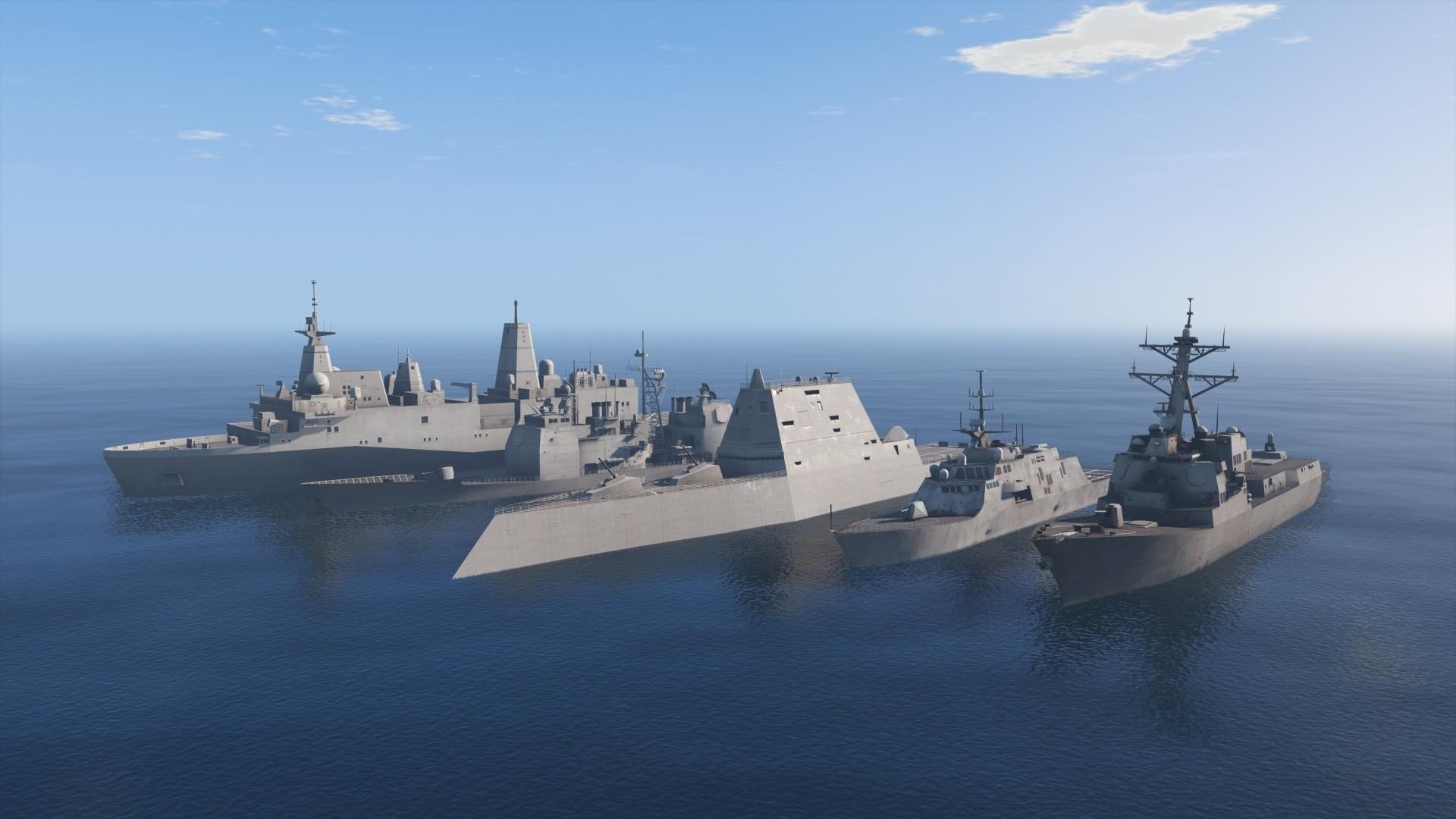 - 场景搭建: 在洛圣都的港口或海面上放置这些舰艇,可以营造出壮观的海军舰队场景。建议搭配《GTA5》中的“军事基地”地图使用。