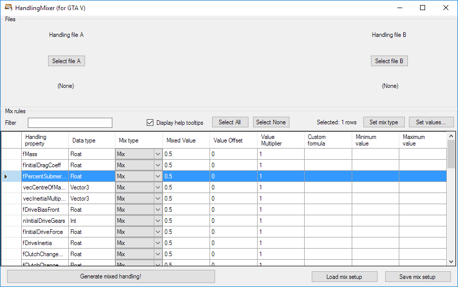 2. 运行 `HandlingMixer.exe` ,进入主界面选择你需要调教的两个 handling.meta 文件(例如原版和一个 mod 版本)。